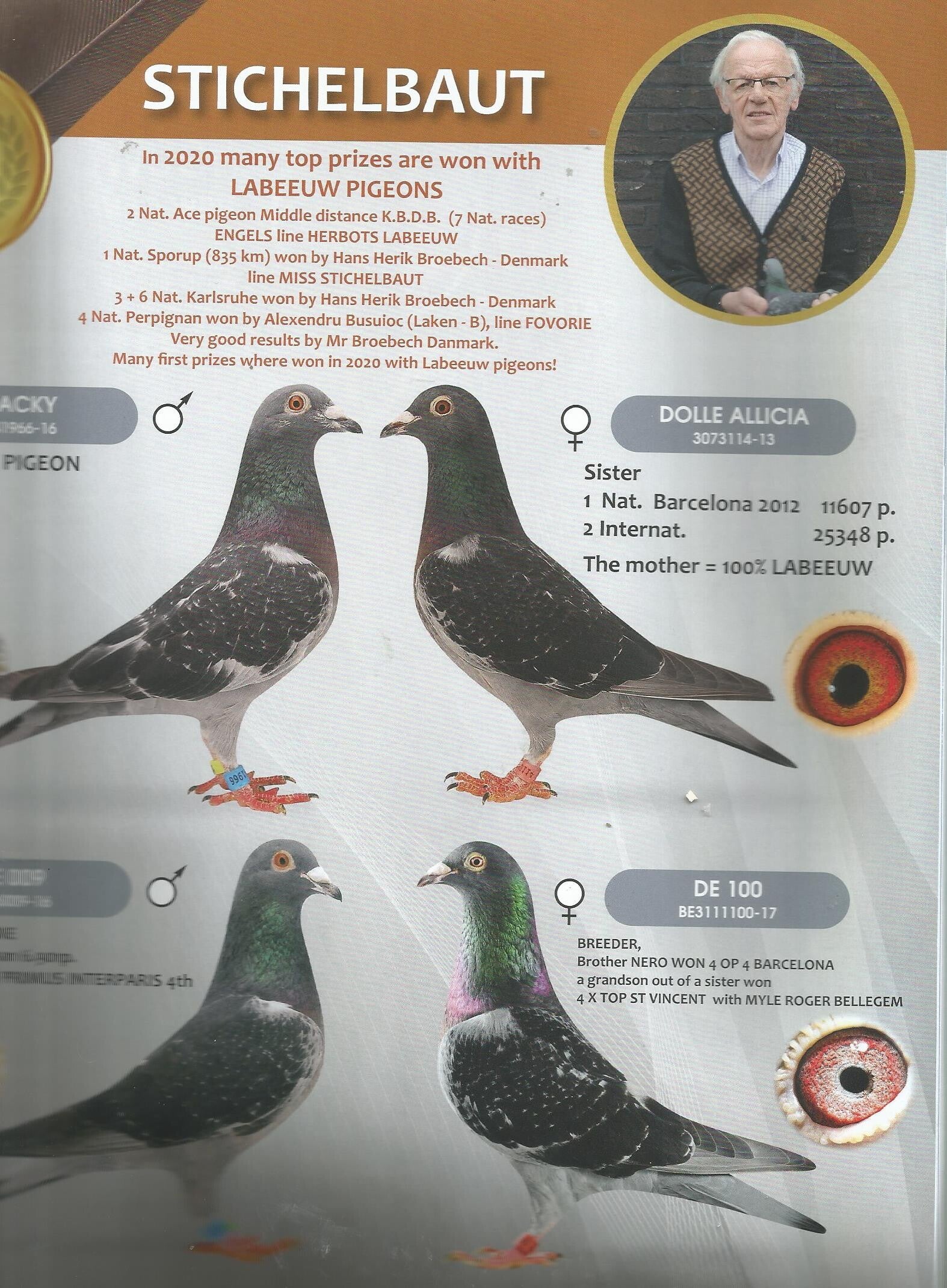 - 1ste Best St Vincent duif België 2014 - 2016 - Mille Roger – vader winnaar een 100% Stichelbaut, genoemd “de Labeeuw”
